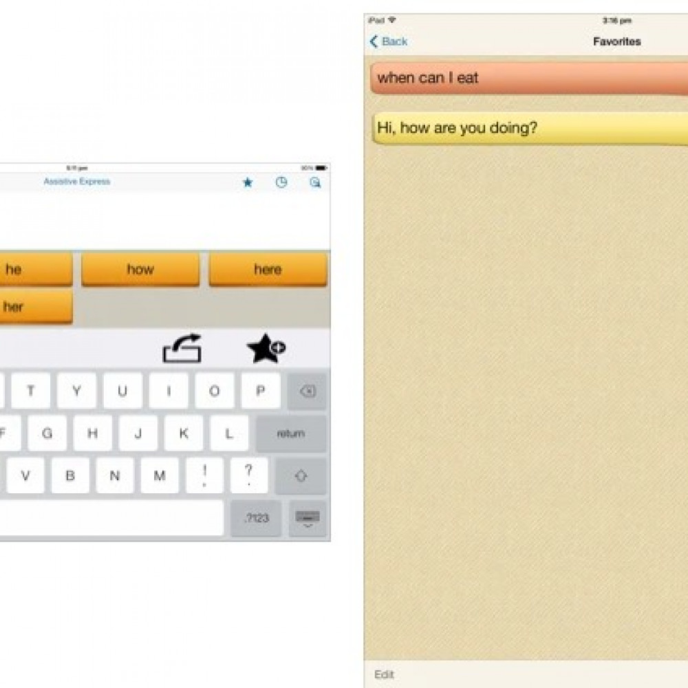 To use Assistive Express, the user types what they want to say onto an on-screen keyboard. With each press of the ‘return’ button, the words are transferred as speech by the device. An option to “speak each word” is also available. This app provides the ability to save favourite phrases as well as store a brief history of recently used phrases.