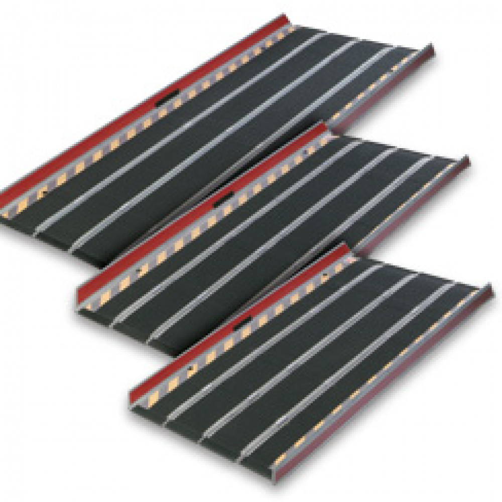 A folding, lightweight, portable ramp to assist wheeled assistive equipment access buildings by a safe slope.