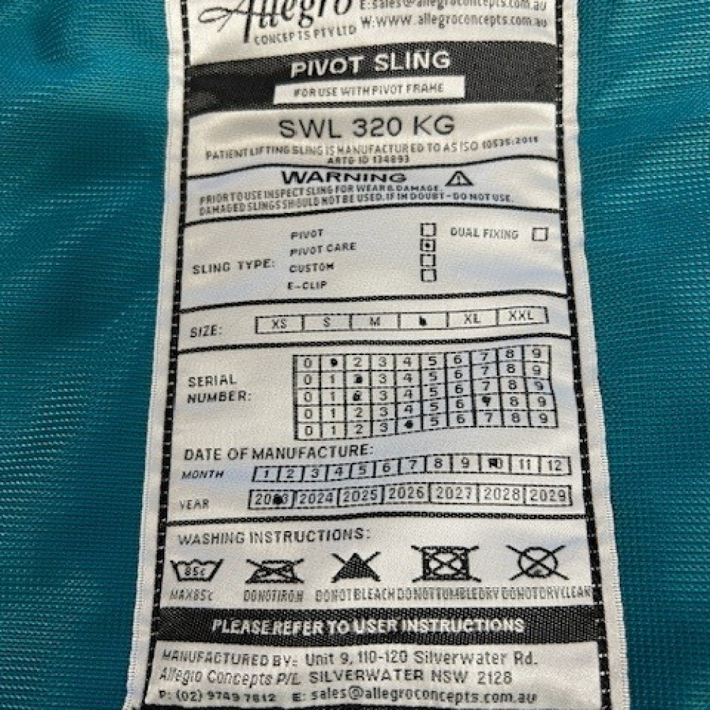 A LARGE size pivot toileting sling, when used with a pivot hoist, is used to support the weight of a person while they are being lifted and transferred.
